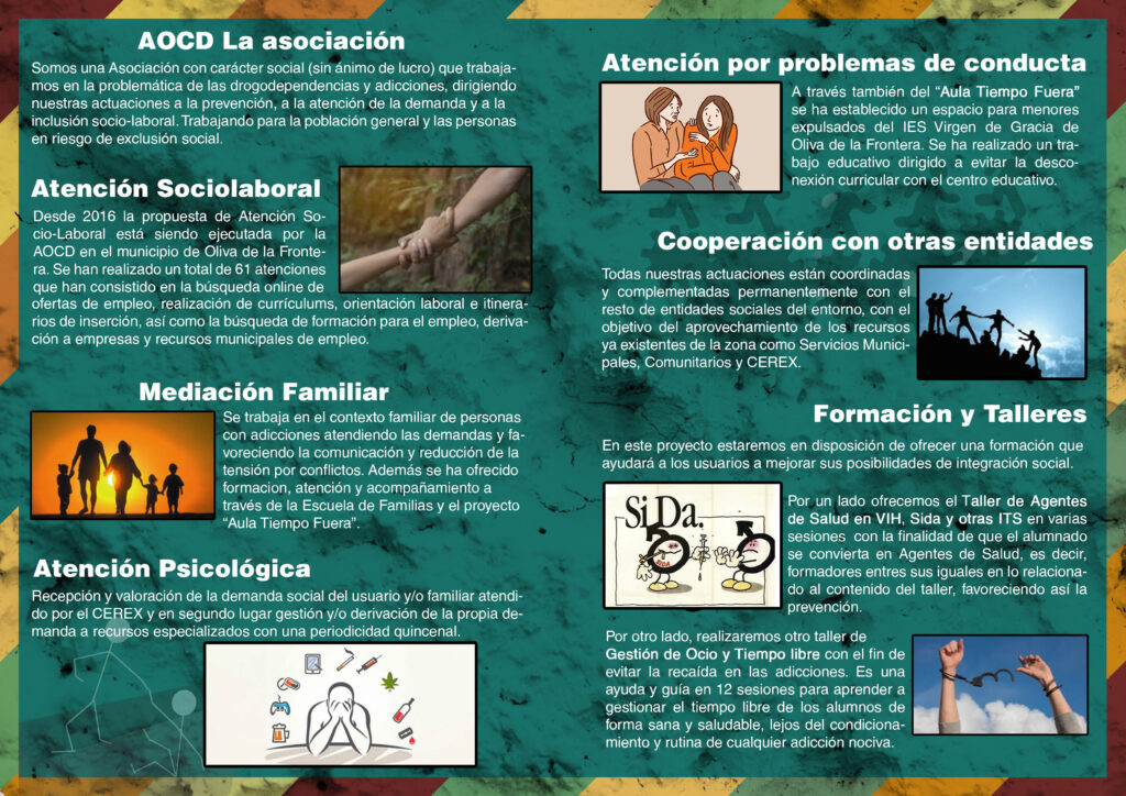 Fui contratado dentro de este proyecto de ámbito social situado en Gibraleón (Huelva) y en su extensión en la AOCD de Oliva de la Frontera (Badajoz). Aunque comenzó siendo en su momento una asociación para la lucha contra la droga esta asociación ha evolucionado con los años y extrapolado sus funciones humanitarias y sociales a muchos ámbitos: empleo, escolarización, antitabaco y un larguísimo etcétera.